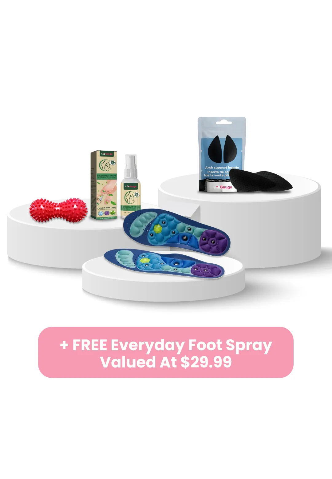 The components are created to support everyday routines. The insoles and arch band may help provide more balanced steps, while the massage ball and foot spray can offer quick relief during or after long days.
