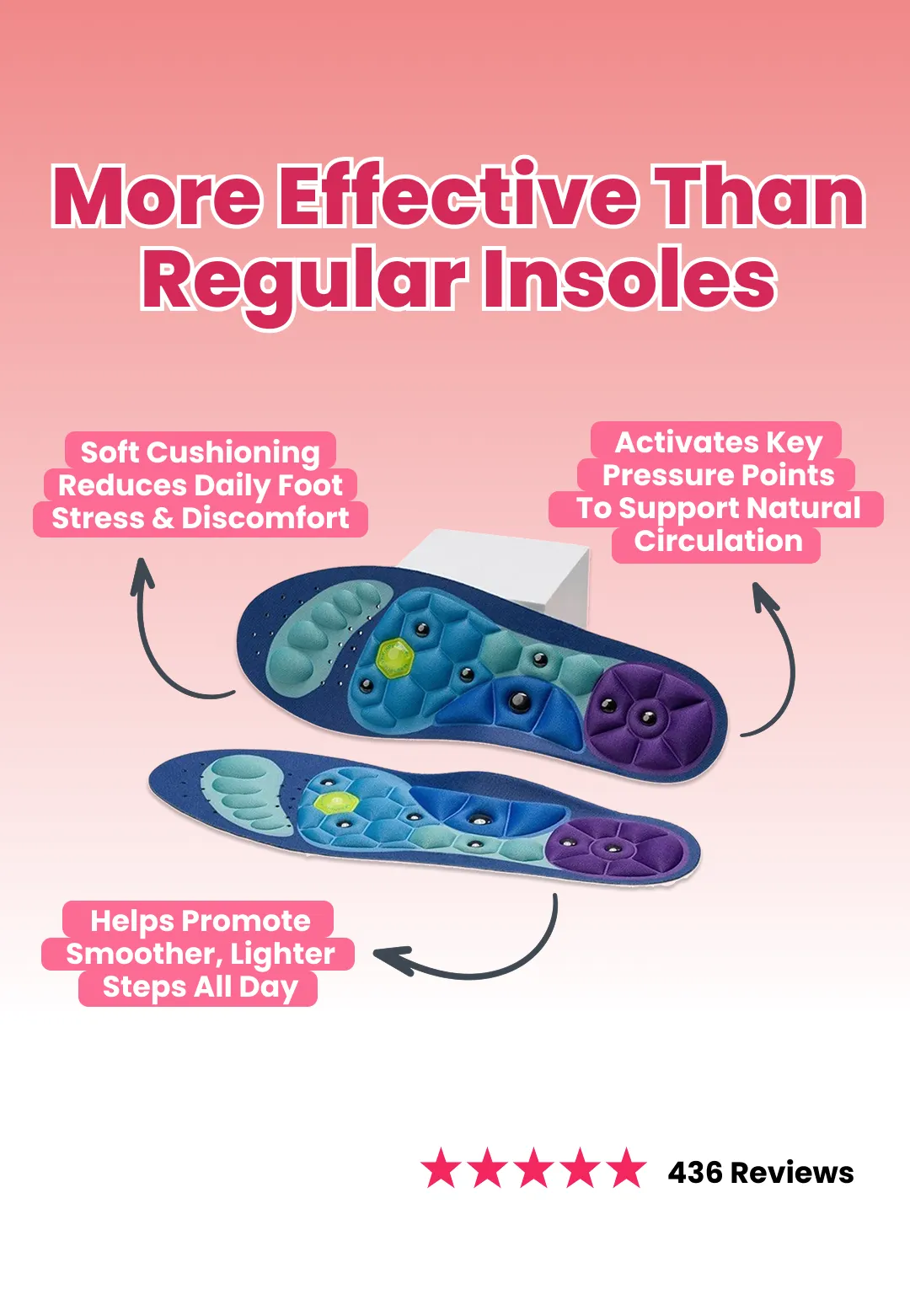 A combination of supportive cushioning and gentle stimulation can help create a more comfortable, balanced walking experience.