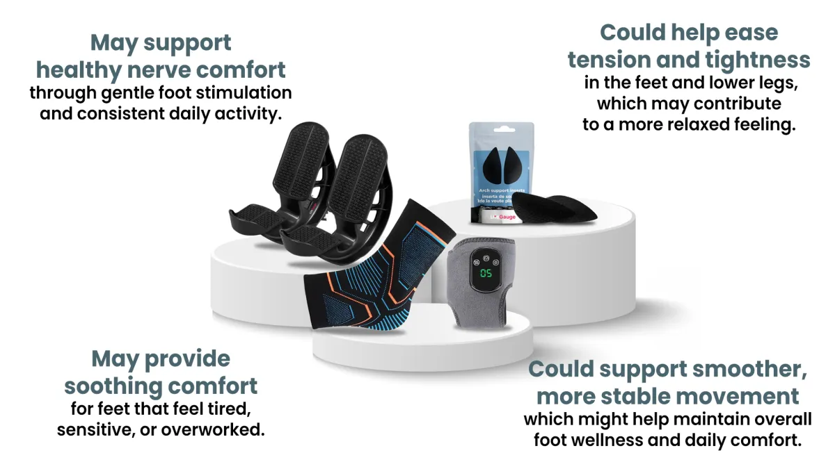 Together, they create a routine that might help the feet feel more engaged, supported, and connected — especially for those who experience tingling, sensitivity, or tired, overstimulated nerves.